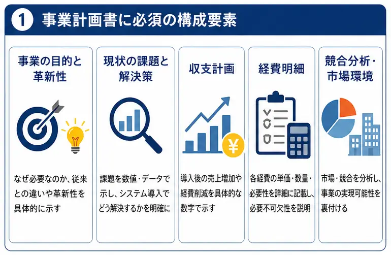 採択される事業計画書には、いくつか必須の要素があります。まず、事業の目的と革新性を明確に示す必要があります。なぜこのシステム開発が必要なのか、従来の方法と比べてどのような革新性があるのかを具体的に記載します。
