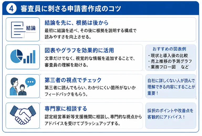 審査員は限られた時間で多数の申請書を評価するため、読みやすさと理解しやすさは採択率に直結します。まず、結論を先に述べ、その後に根拠を説明する構成を心がけてください。図表やグラフを効果的に活用することも重要です。文章だけでなく、視覚的な情報も追加することで、審査員の理解を助けられます。特に、現状と導入後の比較、売上推移の予測などは図表で示すと効果的です。