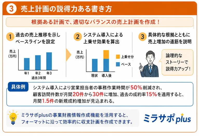 例えば、「システム導入により営業担当者の事務作業時間が50%削減され、顧客訪問件数が月間20件から30件に増加。過去の成約率15%を適用すると、月間1.5件の新規成約増加が見込まれる」というように、論理的なストーリーで売上増加の道筋を示します。ミラサポplusの事業財務情報作成機能を活用すると、フォーマットに沿って効率的に収支計画を作成できます。