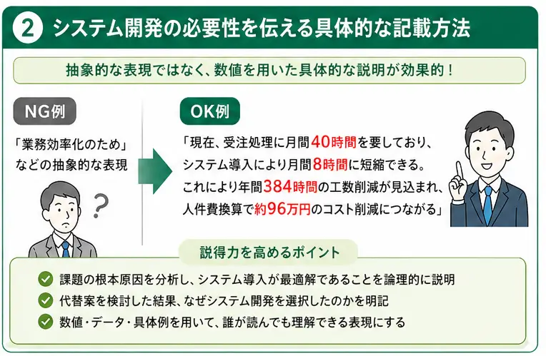 審査員は多くの申請書を読むため、システム開発の必要性を一目で理解できるよう、具体的かつ簡潔に記載することが重要です。抽象的な表現ではなく、数値を用いた具体的な説明が効果的です。